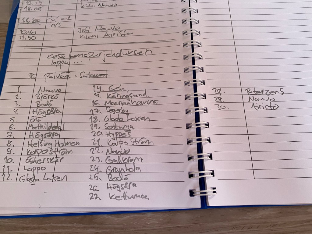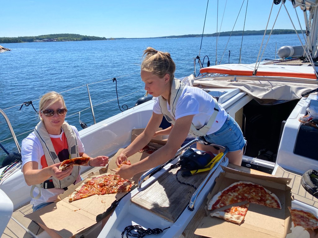 Hyppeisistä oli edessä viikon viimeinen legi kohti kotisatamaa. Pläkässä matka alkoi ja puolivälissä saimme purjeetkin ylös. Kesken matkan meille oli luvassa miehistönvaihdos, sillä ystämme Sveitsistä olivat maisemissa. Sumplimme heille meripäivän siten, että he hyppäsivät vaimoni kyytiin Kaarinassa, josta siirtyivät Airistolle. Siellä siirryttiin moottoriveneeseen, jolla vaimo ajoi heidät sovittuun lounaspaikkaan Torasvikenin pohjukkaan. Me suuntasimme sinne purjeveneellä ja vaikka kauppa ja merenkulku on arvaamatonta, olimme molemmat veneet siellä muutaman minuutin erolla toisistamme. Ankkuri mereen, vieraat kyytiin, piknik pystyyn ja nauttimaan kesästä. Pienen tauon jälkeen vaimo nappasi förstini, eli tyttäremme, kyytiin ja lähti viemään häntä treeneihin. Me puolestaan purjehdimme veneen kotisatamaan.