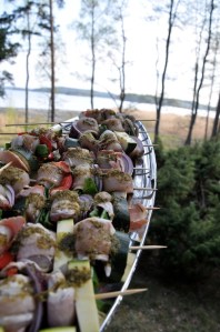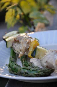 Valmista vartaat. Pilko kanat, paprikat ja kesäkurpitsa sopivan kokoisiksi paloiksi ja pujota vartaisiin vuorotellen kutakin. Rouhi pinnalle pippuria ja suolaa. Grillaa kypsiksi.
