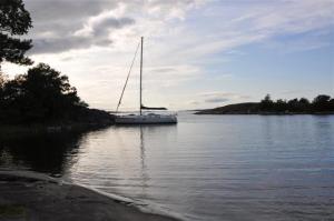Meillä on perässä 20-kiloinen Mantuksen ankkuri. Painoltaan se on hieman alimitoitettu (mainittu maks. 37-jalkaisille veneille), mutta sen pitokyky on loistava. Leveä perämme on tänä yönä kohti tuulta, joten käymme tiputtamassa Samelin kanssa veteen vielä 10-kiloisen pikkukuokan. Sen toisesta suunnasta tuleva veto stabiloi veneen liikkeen täysin ja voimme luottaa, ettemme tuhoa keulamme edessä olevaa laituria yön aikana.