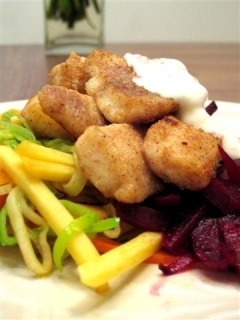 Pinaatti-papupaistos ja paneroitua kuhaa