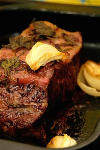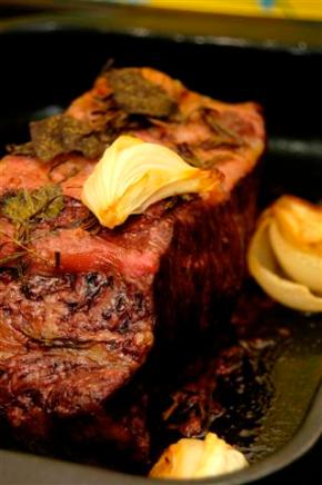Laita lihan pinnalle muutama ruokalusikallinen voita ja nosta liha uunivuoassa 225 asteiseen uuniin ruskistumaan. Ruskista n. 20 minuuttia. Valele lihaa paistamisen aikana lihasta valuvalla liemellä ja sulaneella voilla (lisää tarvittaessa tilkka vettä). Ota uunista, mausta suolalla ja laita takaisin uuniin n. 150 asteeseen. Kypsennä, kunnes sisälämpötila on n. 57 astetta (noin 1,5 tuntia). Lihan kuuluu jäädä sisältä punertavaksi.