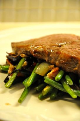 Poista pavuista kuivat päät. Keitä kypsiksi suolalla maustetussa vedessä. Pilko sipuli siivuiksi ja pekonit paloiksi. Laita pekonit kylmään pannuun ja levy päälle. Kun pekonit ovat kypsiä, lisää sienet, sipulit ja keitetyt pavut. Paista miedolla lämmöllä sen aikaa, kun paistat toisella pannulla pihvit.
