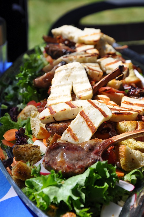 Mausta karitsa suolalla ja pippurilla. Grillaa roséksi samalla kun grillaat halloumiin kauniit raidat. Lisää kaikki salaattiin, tarjoa heti oliiviöljyn, Maldon-suolan ja mustapippurin kanssa maustettuna.