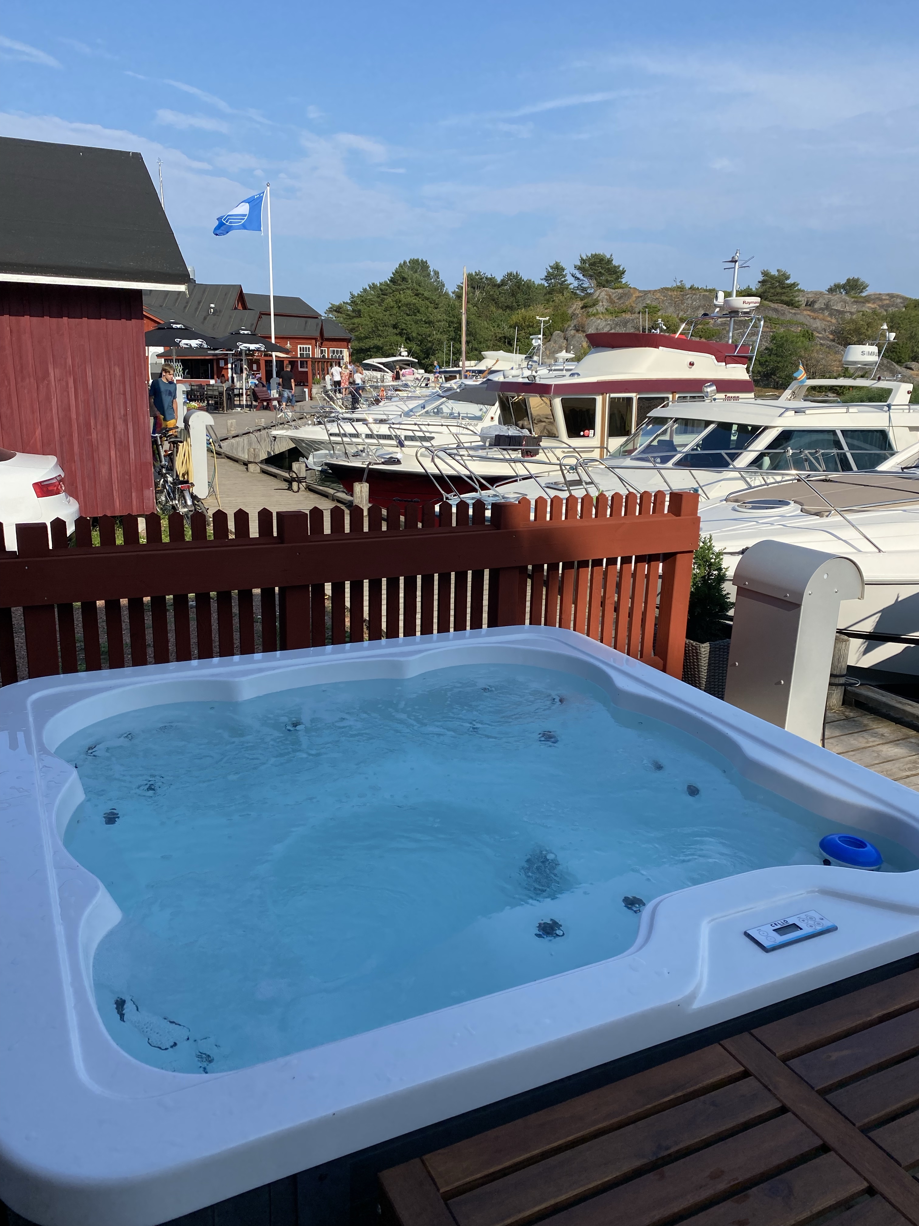 Karlbyhyn on valmistunut uusi kaksikerrossauna laiturialueen länsipäähän. Pakkohan se oli testata! Hinta ei ole halpa (sauna 125€ / 1,5h ja poreamme 50€ siihen päälle), mutta kohderyhmänä lieneekin hotellin seminaari- ja yrityskäyttäjät. Mutta toisaalta, kuka tahansa hinnasta itkevä voi itse avata excelinsä, laittaa siihen rakennuskustannukset, parin kuukauden sesongin, kolme saunavarausta per päivä ja sitten ihmetellä, että mikä taloudellinen järki koko hommassa oikein on. No, saunan seinässä oli isolla EU-logot ja Smart Marina -tunnukset, eli osa maksamistamme EU-euroista oli näemmä saatu takaisin. Hyvä niin.