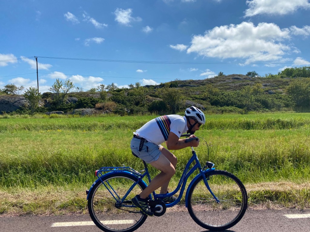 Sunnuntaina oli sporttipäivä! Vuokrasimme mammapyörät hotellilta ja poljimme Kökarin frisbeegolfradalle. Rata sijaitsee Peders Aplagård -omenatilalla. Koska oli kuuma, nautimme pullot heidän omaa alkoholitonta omenasiideriään ennen peliä. Itse frisbeegolfissa ei ollut tällä kertaa mitään järkeä. Rata menee upeissa maisemissa, mutta tässä kohtaa kesää, kaikki (paitsi kalliot) kasvavat pienen miehen kokoista heinää. Tuuli oli kova, joten kiekkoja lensi sinne tänne. Pelasimme kolme väylää, käytimme aikaa 1,5 tuntia ja hukkasimme kolme kiekkoa. Sitten päätimme keskeyttää.