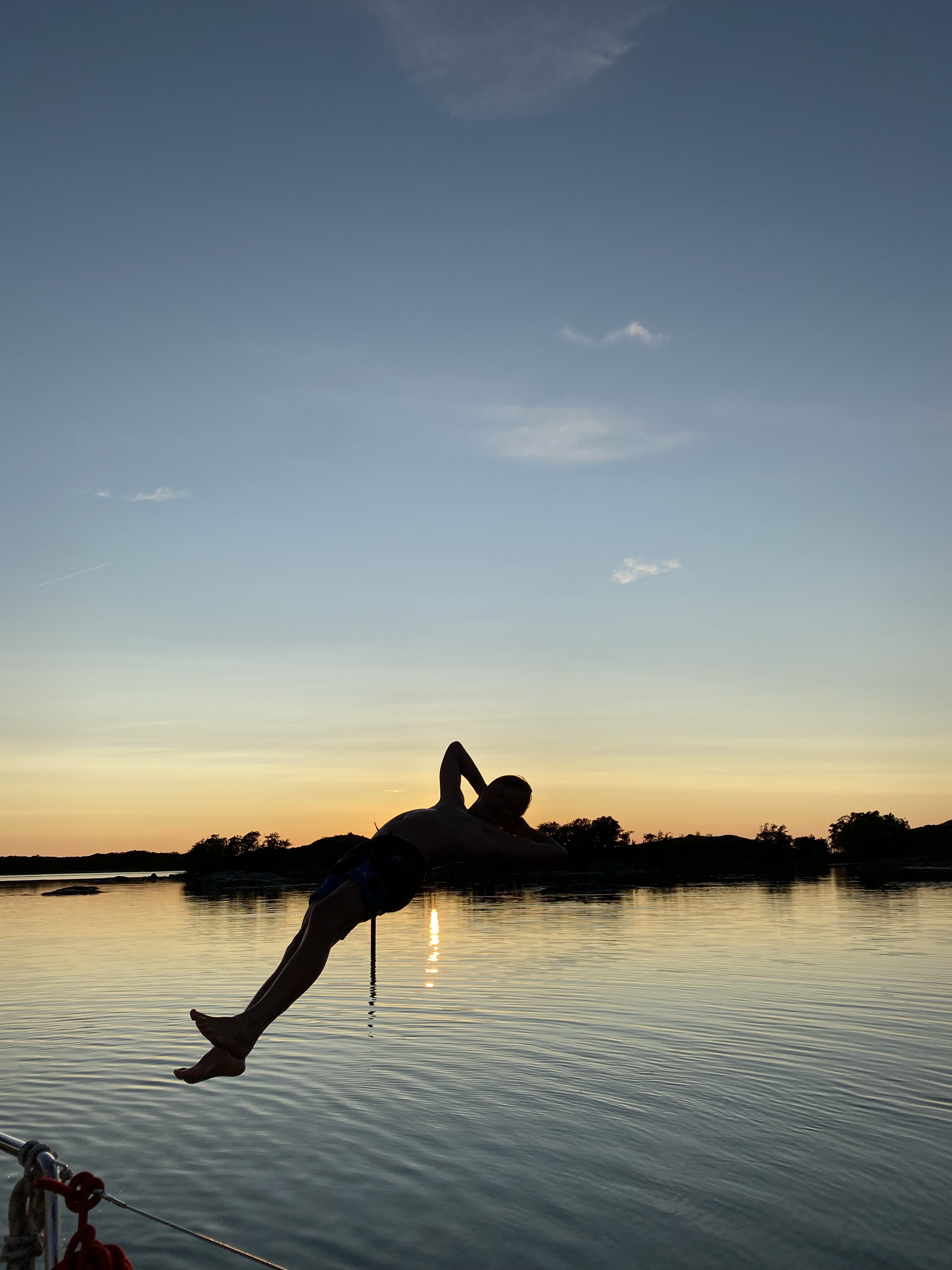 Tänään oli sellainen päivä, josta myös teini piti: Sandön edustalla laskimme taas veneen perään köyden, jonka päässä on fendari ja halukkaat saivat hyppiä uimaan.