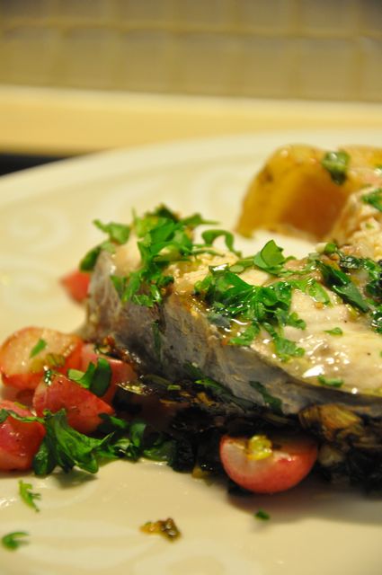 – – neljä paksuhkoa palaa sammesta – – 250 grammaa retiisejä – – ½ ruukku basilikaa – – ½ ruukku persiljaa – – nippu kevätsipulia – – ¼ sitruunan mehu – – 50 g voita – 2 rkl ruokaöljyä – – merisuolaa ja pippurisekoitusta myllystäVALMISTUS