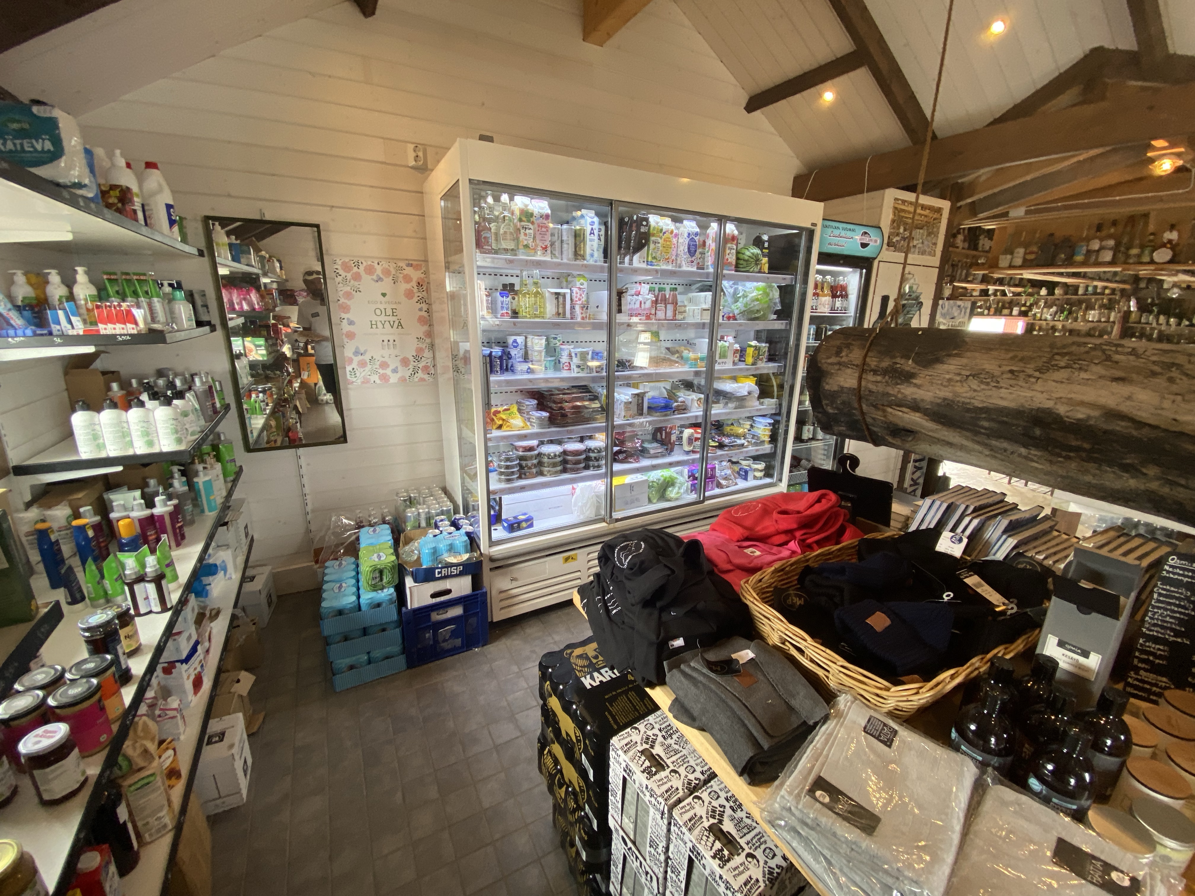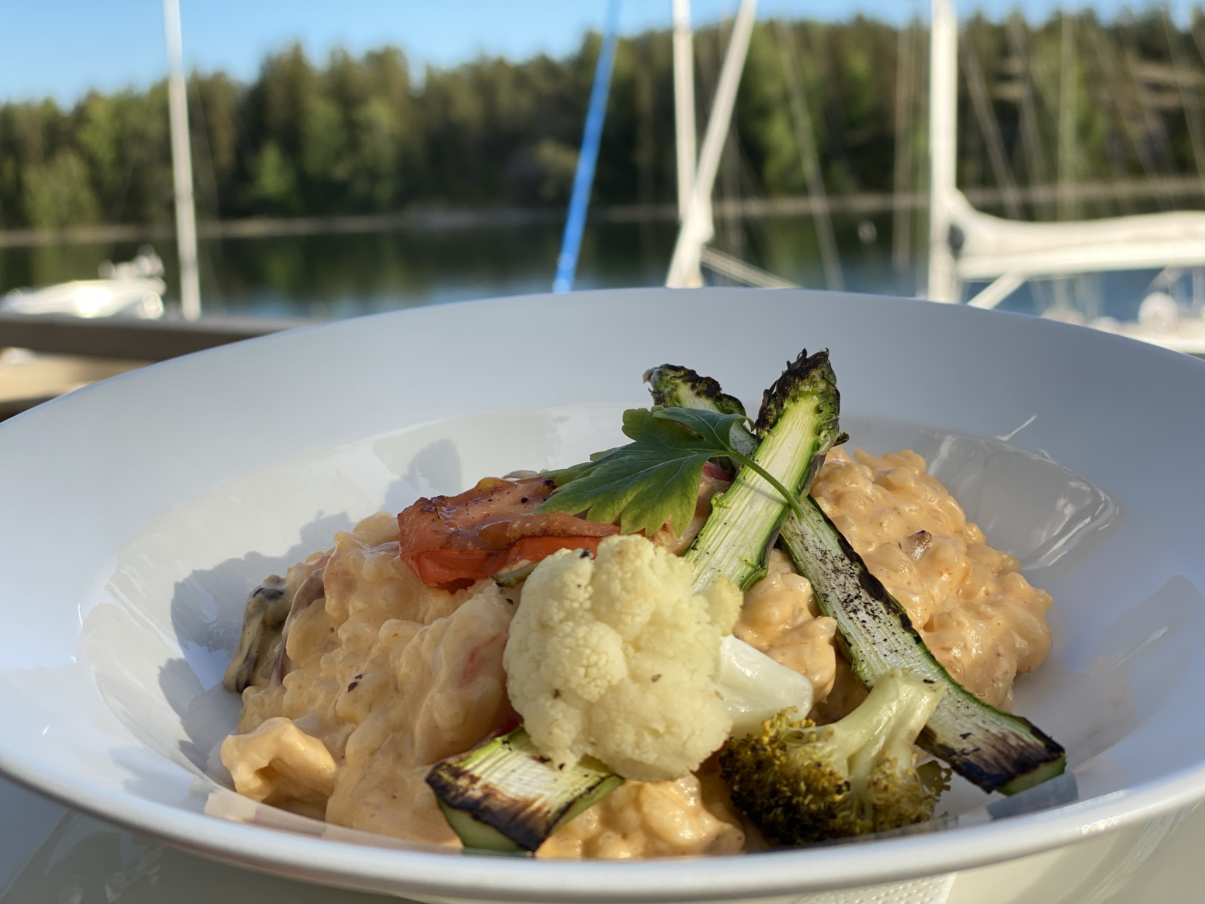 Klas Matssonin pitämä Jurmon kauppa on uskomaton. Pieneen tilaan on saatu mahtava valikoima, myös tuoretuotteita, marjoja, herneitä, kasviksia ja hedelmiä. Meillä oli tarkoitus grillata jotain vakuumiribsejä, mutta satamamaksua maksaessani kantoi Klas juuri savustettua lohta sisään. Tuoksu vei mennessään! Poimin kylmäkaapista myös aivan taivaallista rosepippurilla maustettua graavilohta. Lisäksi mukaan tarttui tuoreet marjat, herneet ja kasviksia grilliin.