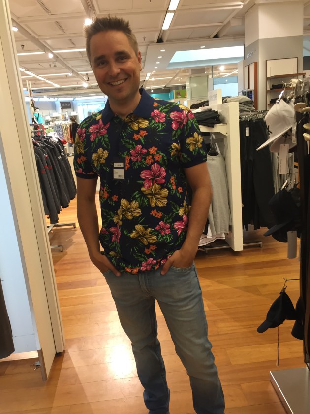 Visa sai minut jopa hetkeksi harkitsemaan kukkapaidan hankkimista. Sellaiseen ostotranssiin hän luontevalla, aidolla ja auttamishaluisella käytöksellään minut sai. Huomasin pukukopissa vaatteita vaihtaessani, että hän palveli simultaanisti kolmea muuta asiakasta samalla pieteetillä. Pukukoppiin kantautui myös hänen keskustelut vaimoni kanssa. Yhdessä he spekuloivat värejä ja kuoseja, jotka minulle saattaisivat sopia.