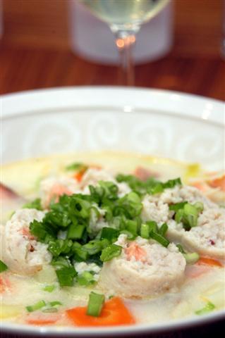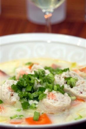 Valmista keitto. Pilko perunat, purjo, porkkanat, selleri ja valkosipuli. Laita kattilaan voi ja kuumenna. Paista valkosipulia voissa hetki. Lisää kattilaan purjosipuli, selleri, perunat ja porkkanat. Kuullota kasviksia muutama minuutti ja lisää valkoviini. Anna kiehahtaa. Lisää kalaliemi ja mausta. Kun kasvikset ovat kypsiä, lisää kerma ja haukiquenellit sekä kylmäsavulohi. Lisää nestettä tarvittaessa (kalalientä). Anna tekeytyä muutama minuutti ja tarjoa pinnalle ripotellun kevätsipulin kera.